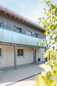 Eine architektonische Besonderheit ist der Laubengang im Obergeschoss, dessen komplett geschlossenes Metallgeländer höchste Brandschutzanforderungen erfüllt. Auf ein klassisches Treppenhaus wurde bewusst verzichtet: Jede Wohnung ist direkt von außen zugänglich – ein außergewöhnliches Konzept, das dem Gebäude einen offenen und zugleich privaten Charakter verleiht.